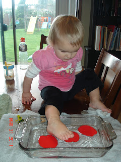 Okay, not a great picture of the activity, but so typical of our 1-year-old :) For F week, we did frogs, fish and floating with this activity. I got a package of plastic frogs from the dollar store, then cut out lilly pads from foam craft paper (don't know why it's red, I could have used green) :) Then I cut out some small colorful fish from the foam paper so they could float too. Fill up a pan with water. I always put a towel underneath because we usually have some spills. The kids can float the lilly pads on top of the water, then if you carefully sit the frogs on top of the pads they both float! They play with these for quite a while. The frogs hop off and into the water, then back on the lilly pads. We try to see how many frogs will fit on one lilly pad before it sinks.